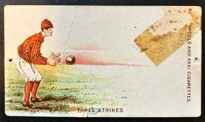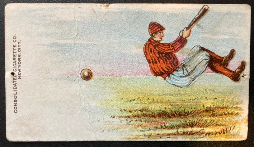 There are also two different sizes for the cards that have been reported. One type is generally reported at 1 5/8″ by 2 7/8″ with a second type approximately 1/2″ bigger on each side. However, my card is slightly smaller by about 1/16″ of an inch in each direction and does not appear to be trimmed. I believe the measurements that have been reported could be slightly off — often measurements are rounded up or down to the nearest 16th of an inch as I’ve seen in other early sets. Another possibility, of course, is that it was similar to other 19th century tobacco cards (i.e. Old Judge) where the measurements were routinely a bit off.