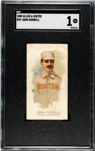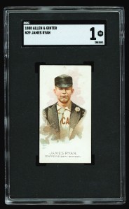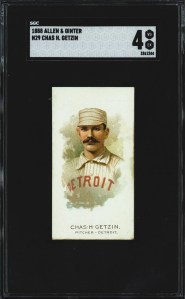 This summer, I picked up really nice examples of James Ryan and James Fogarty — two really gorgeous cards. And then, last month, I scooped up this way-too-gorgeous-for-me card of ‘Pretzels’ Getzien, clearly an outlier as an SGC 4 as opposed to the 1s and 2s I am accustomed to. And if you’re wondering, it’s my spelling of Getzien that’s correct — not the ‘Getzin’ on the uncorrected error card.