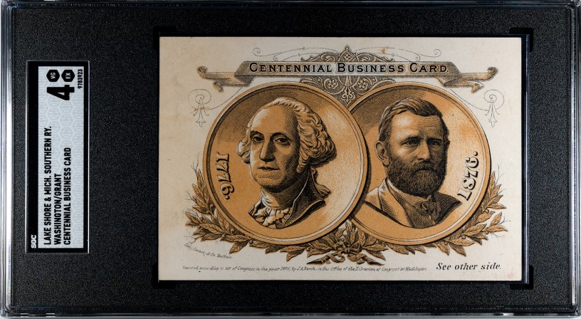 The card in question is called the ‘Centennial Business Card.’ That title runs across the top of the front, which also includes medallions with the first President, George Washington, and then President Ulysses Grant. The card is a celebration of the first 100 years of America, spanning from 1776 to 1876.
