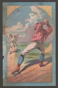 These baseball cards are dated to 1882 and were produced in a small set. They are usually referred to as the Circled Positions cards, since they picture baseball players all over the diamond and were printed without captions or any better way to identify them. They are also catalogued as H804-11. Here’s a picture of one I used to own.
