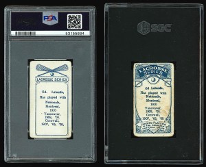 Lalonde has four cards in the three Imperial Lacrosse sets (he also appears in each of the three Imperial hockey sets, too). I’ve been working on the lacrosse sets and have about 160 of the 248 total cards. Recently, I was glad to pick up the fourth of the Lalondes. I thought a post on these would help as there’s some confusion (perhaps even with grading companies) regarding them.