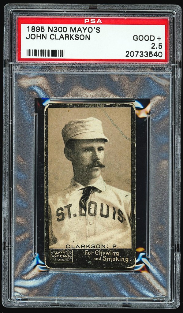 I’ve always liked the N300 Mayo baseball cards but I didn’t buy one until this year. I’d also been craving a Cap Anson, so this PSA 2 shown here scratched both of those itches. Anson is the most famous player in the set, and one of many Hall of Famers, including the likes of John Clarkson, Dan Brouthers, Hugh Duffy, Buck Ewing, Kid Nichols, John Ward, Amos Rusie, and more. As if the set was not difficult enough to build, some of those players have more than one card to reflect trades, correct misspellings (Rusie), or, in the case of Ward, denote that he went from being an active player to a retired one. The set also has a number of established stars, including Jack Glasscock, Bill Dahlen, and others that aren’t quite Hall of Famers but usually sell for more than common players do.