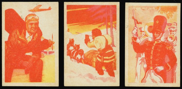 The second card depicts a hunter in a snow scene while the third is a drum major. All three of the cards have the same ink issues.