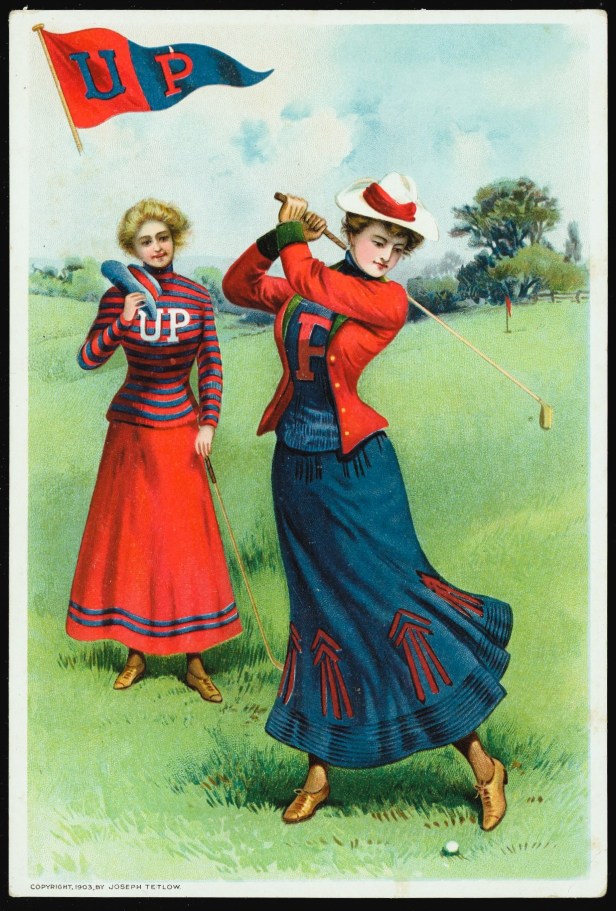 Next on the totem pole would be an early golf card, featuring two women playing the sport and representing the University of Pennsylvania.