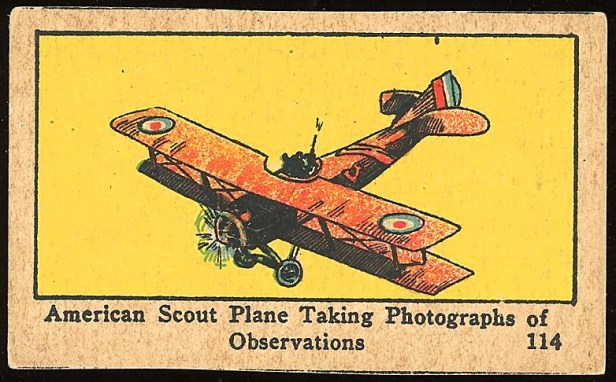 The most intriguing cards in the subset are likely those from No. 110-120, which picture planes and other flying machinery. Aviation cards have gotten more popular and, even though there are no actual subjects named, the names of the actual planes are actually included on several.