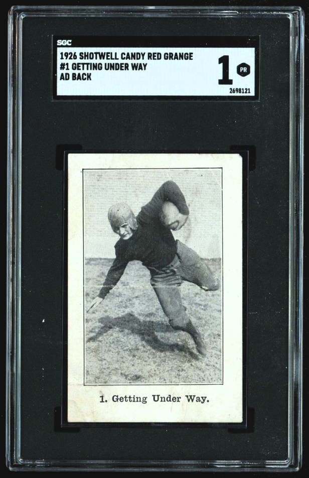As you might know, Hall of Famer Red Grange is found in two different sets from Shotwell Candy from 1926. He’s not only found in them, but the sets are entirely about him. One set features Grange as a player and has advertising for Shotwell on the back. The other features him in a movie with blank backs.