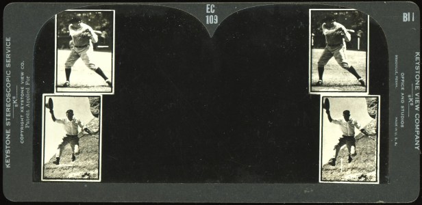 This is a fairly unusual card as most stereoviews simply have two nearly identical images. This one has two sets of photos. One features Ruth but the other features a man jumping with a pyramid background. While Ruth is easy to identify, the other subject isn’t nearly as well known.