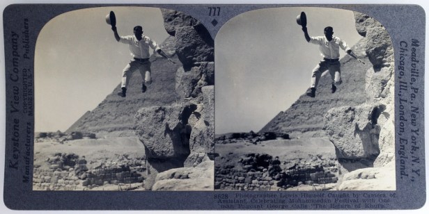 “The second photo is actually of Keystone’s most famous photographer George Lewis,” he says. [It] shows him jumping down off of the great pyramid at Giza in the early 1930’s and is a portion of card number 777 from their rare 1200 card Tour of the World set.”
